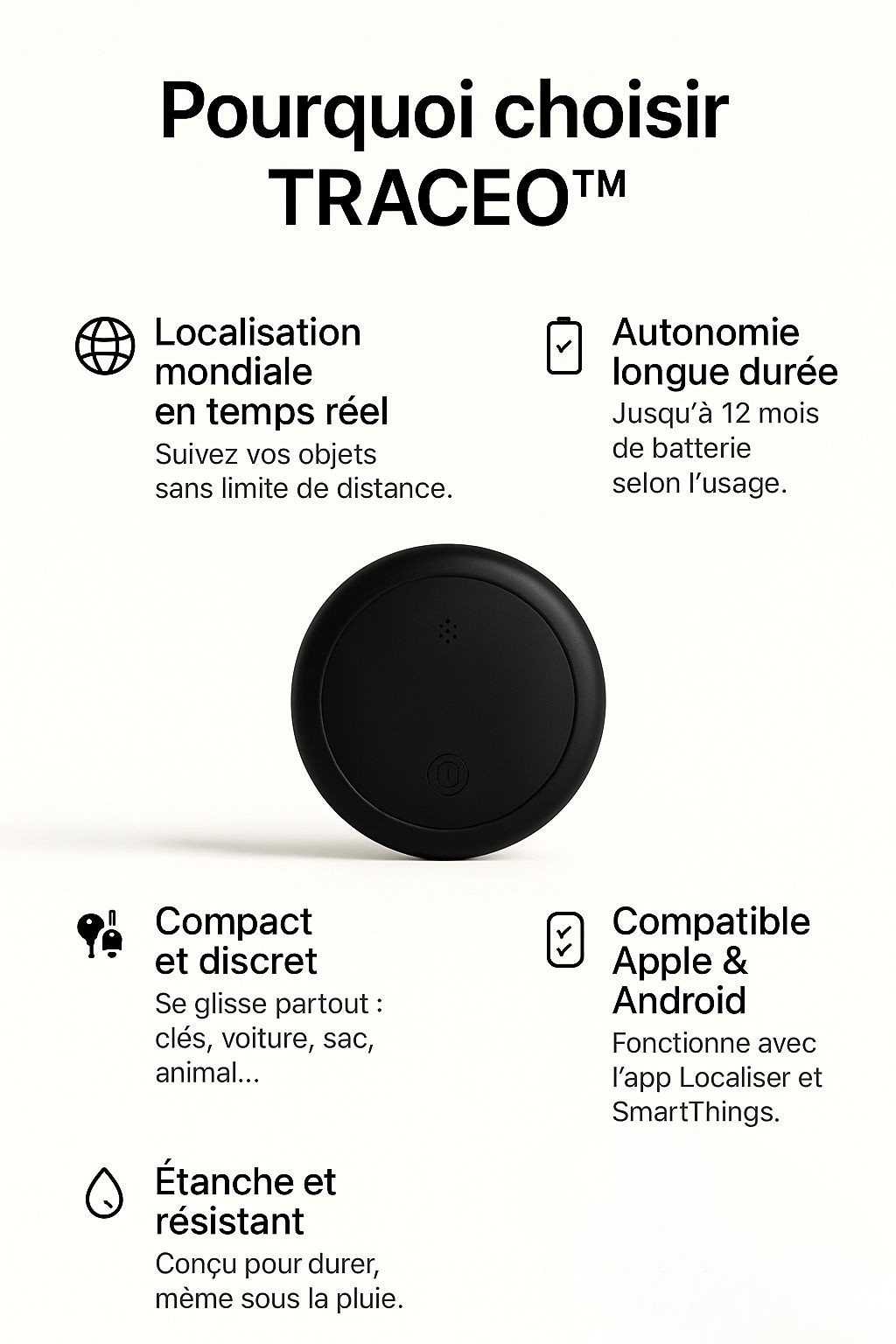 Traceo™️ est couvert par une garantie de 2 ans contre tout défaut de fabrication. En cas de problème, notre service client se charge du remplacement rapidement.